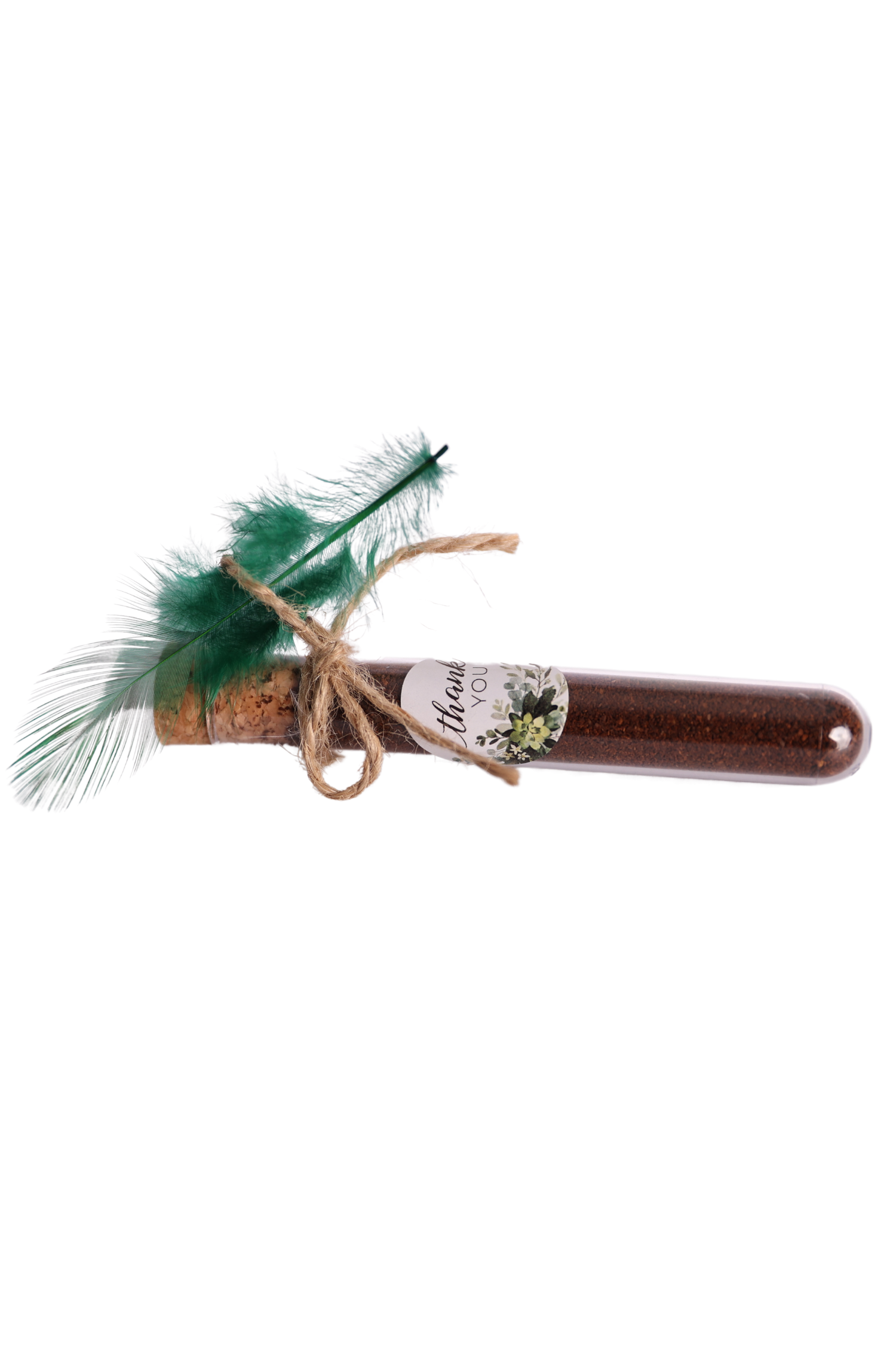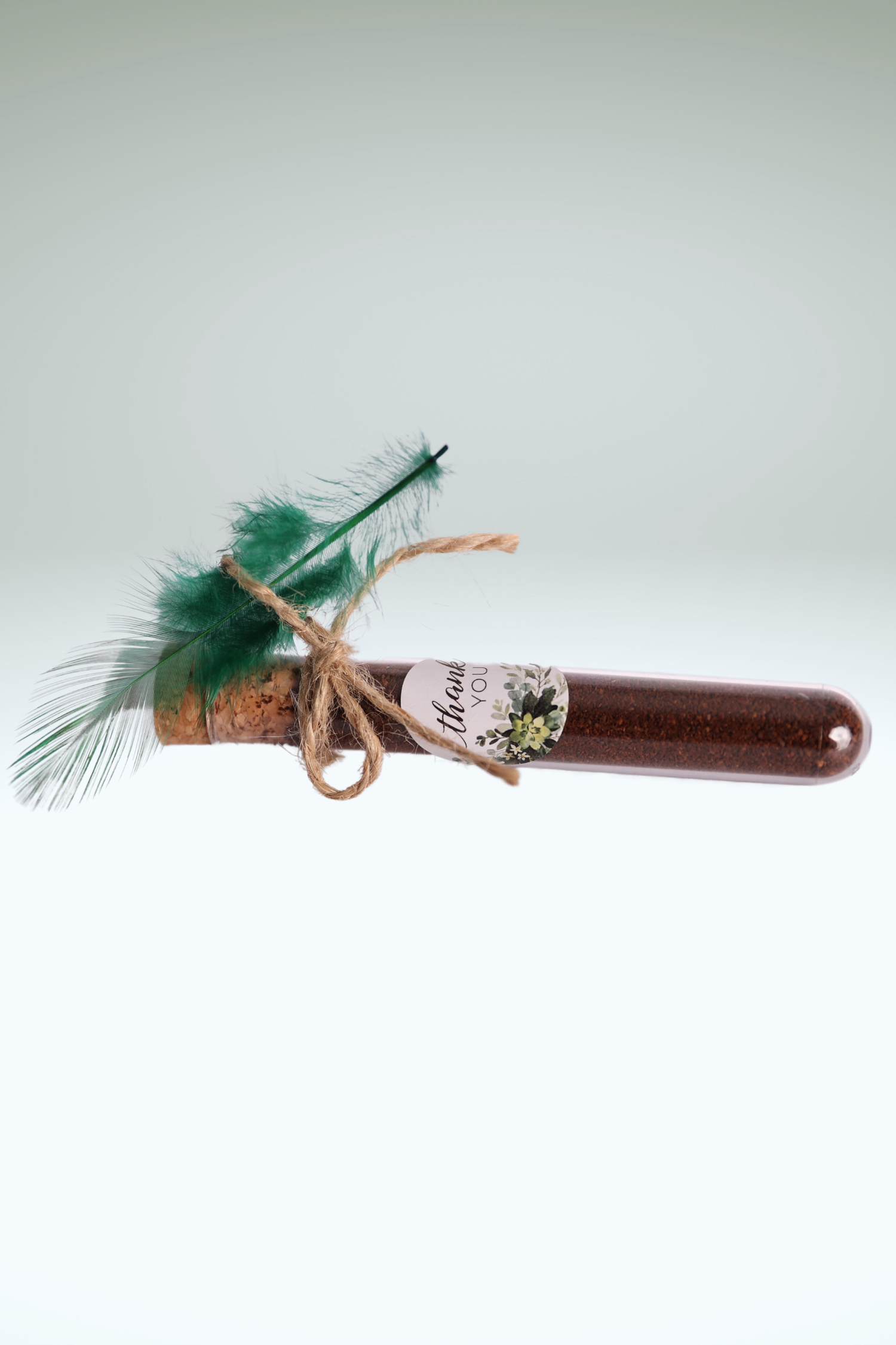 Reagenzglas gefüllt mit feinstem Arabica Kaffee, verziert mit einer Naturfeder, Juteband und einem blumenverziertem Etikett (Aufschrift „Thank You“)